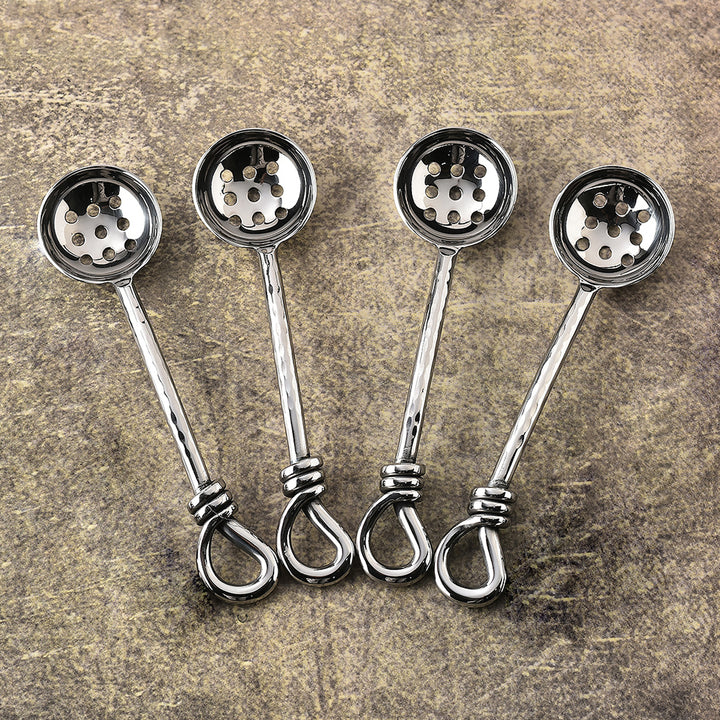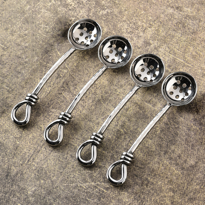 The Gilded Helical Hammered Olive Spoon Set is a study in poise, anchored by a sculptural knot that rests in the palm with reassuring gravitas and grace. The hand-hammered handle glitters with artisan facets, catching light like a private constellation while ensuring a confident, non-slip hold for precise, elegant pours. Its helical motif nods to timeless knot lore—endless, interlaced, and enduring—marrying ancient symbolism with modern craft. Perfectly scaled and exquisitely balanced, it transforms cocktail hour into ritual, and shared moments into heirloom