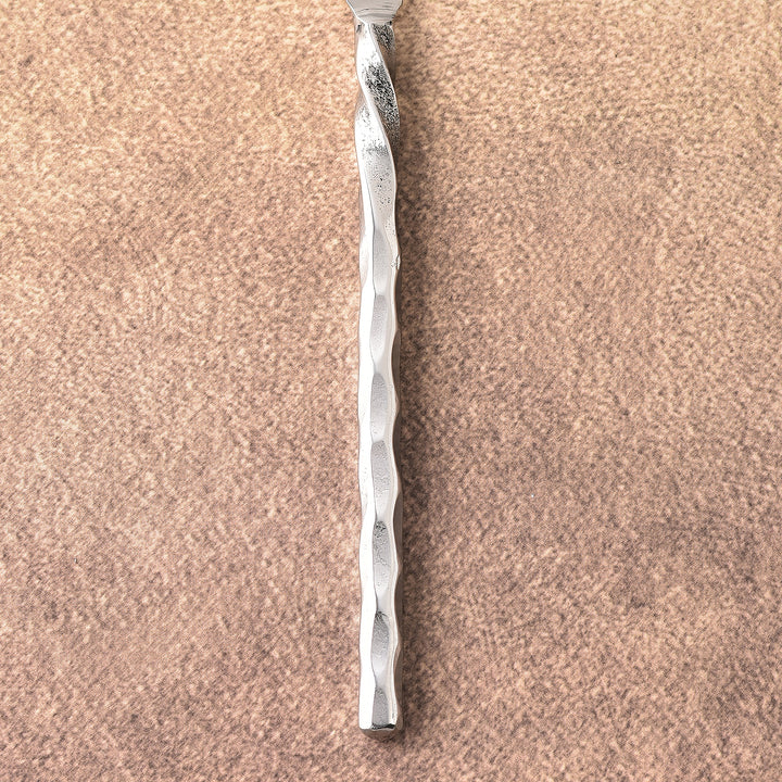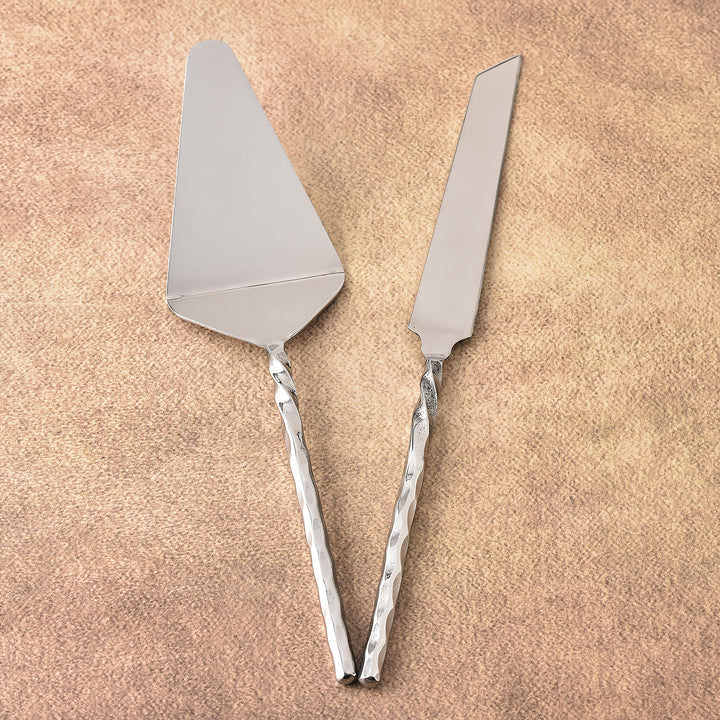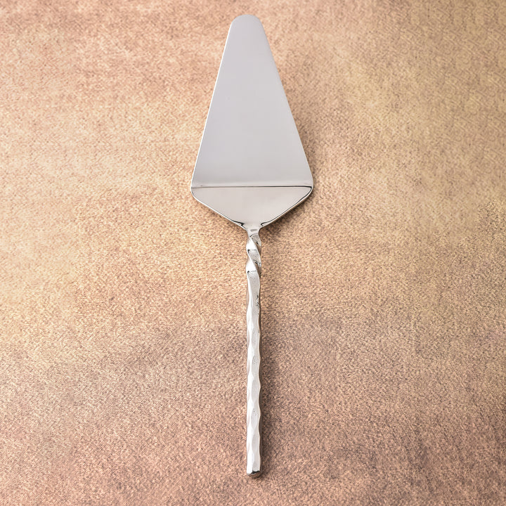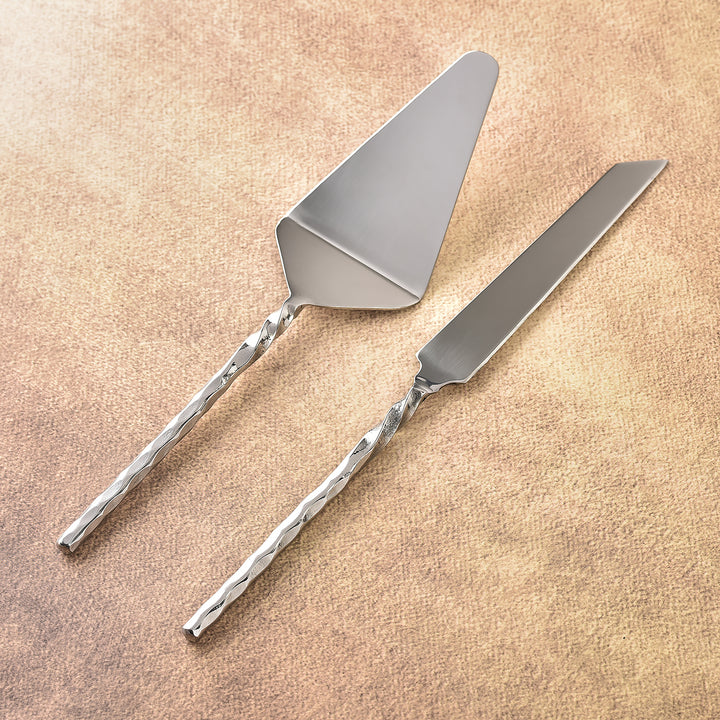 The Helix Hammered Cake Server Set is pure celebration, sculpted into form. Its handle swirls with a playful twist, as if motion itself was frozen in gleaming metal. Artisanal hammered facets shimmer like confetti, scattering light with every festive slice. Beyond its beauty, the textured spiral offers a graceful, confident grip—perfect for that unforgettable first cut. Designed as a wedding-worthy statement, this set balances artistry with function, ensuring each cut feels as timeless as the memory it creates.