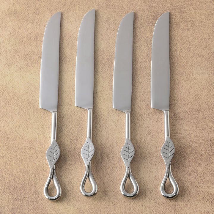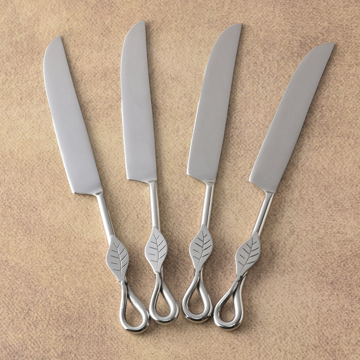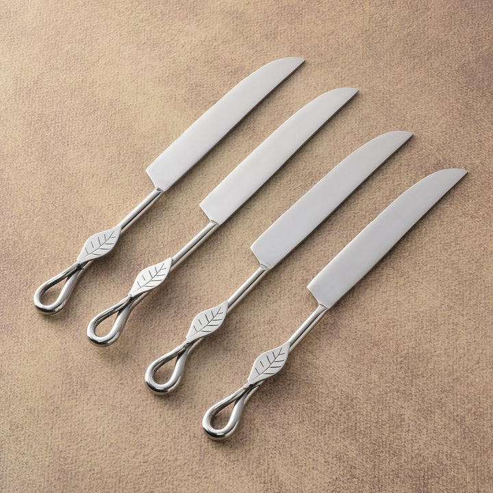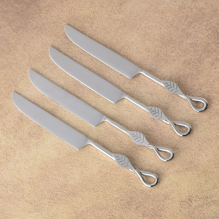 The Laurel Steak Knife Set embodies nature’s artistry and refined craftsmanship. Each polished stem blossoms into a delicately veined laurel leaf, offering a natural rest for the thumb and effortless comfort in use. Flowing seamlessly into a poised teardrop loop, the design balances grace with substance. Ergonomically attuned and visually striking, this set transforms dining into a ritual of elegance, where every detail feels harmonious and timeless.