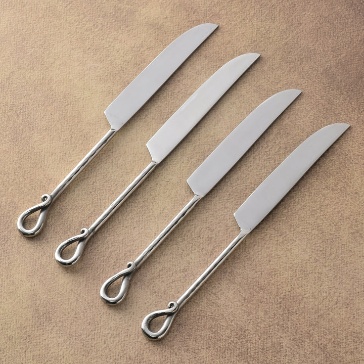The Twirl Hammered Steak Knife Set commands the table with kinetic shimmer and confident balance. Hammered 18/8 stainless steel catches light like liquid metal, flowing into a calligraphic double loop that rests impeccably in hand. Serrated blades glide through prime cuts with refined precision, while the sculptural handles amplify candlelit ambiance. More than utensils, these knives shape the mood—elevating every steak course into a luxurious, artful ritual of texture, flavor, and light.