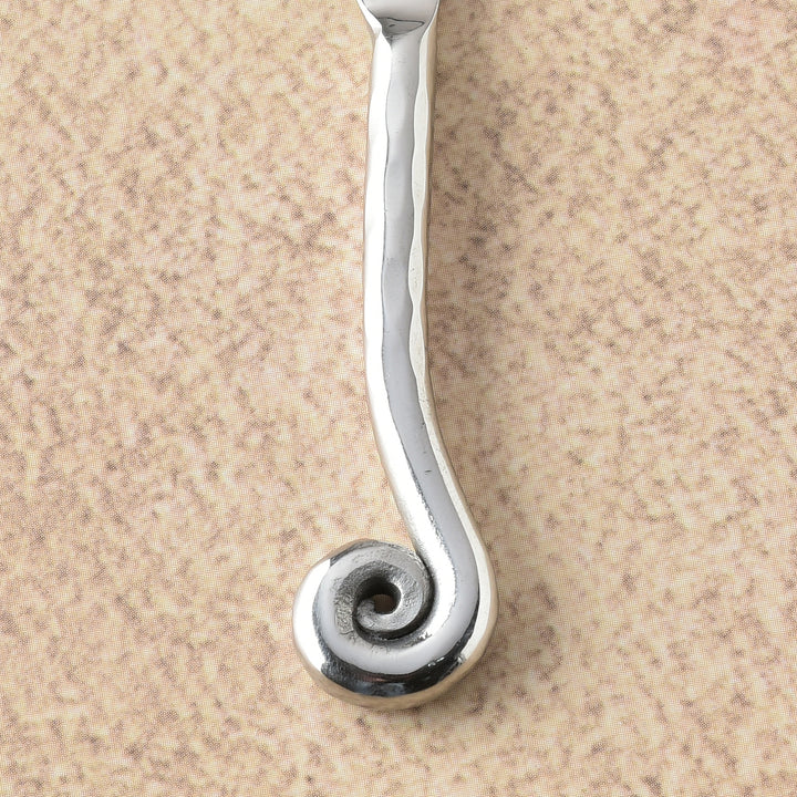 Whorl Hammered Mini/Kids Curved Cheese Knife, Soft Cheese Knife, and Stilton Scoop bring poised precision to every cheese course. Mirror-polished, child-friendly curves and hand-hammered handles offer a confident, slip-free grip, ideal for delicate soft cheeses and tidy Stilton scoops from the center without disturbing the rind. The curved soft-cheese blade minimizes surface contact to reduce sticking, while the classic scoop serves creamy blue with elegant control. Each piece finishes with a coiled whorl—an artisanal flourish of refinement.