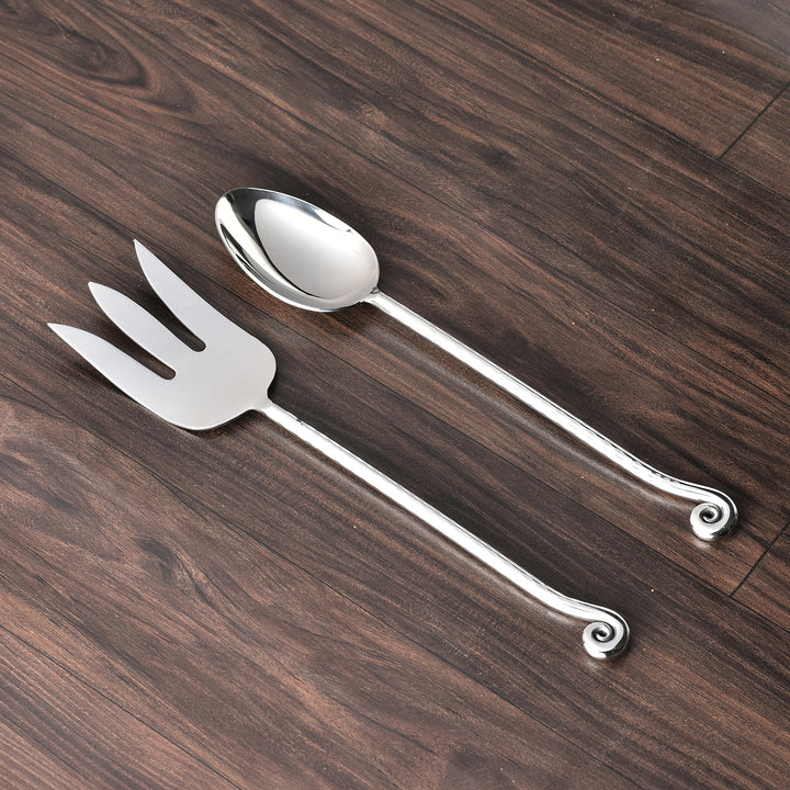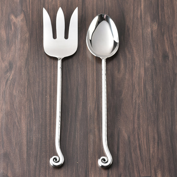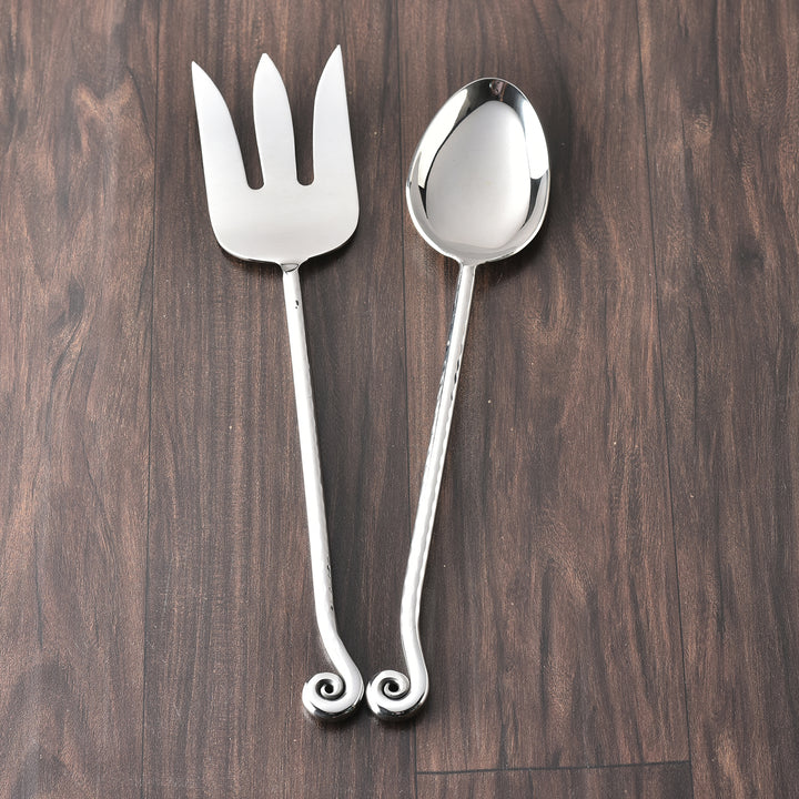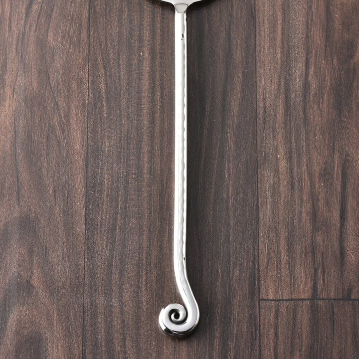 Elegantly poised and purposefully tactile, the Whorl Hammered Salad Server Set pairs minimalist grace with sculptural intent. Long, mirror-polished handles catch the light, while hand-hammered facets offer a confident, balanced grip for effortless tossing and serving. Each piece culminates in a quiet coiled flourish—an artisanal accent that feels intentional in the hand and striking on the table. Crafted in durable steel and shaped for generous bowls, these servers turn simple greens into a refined ritual.