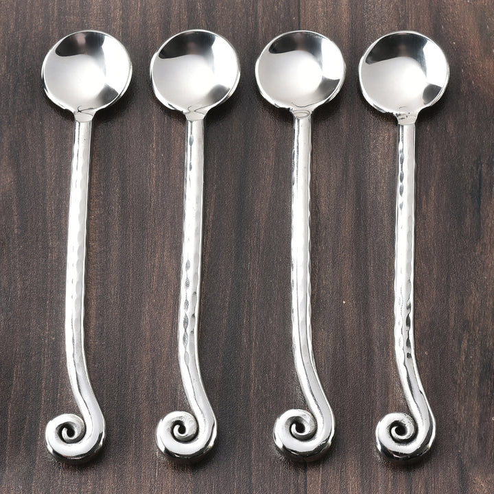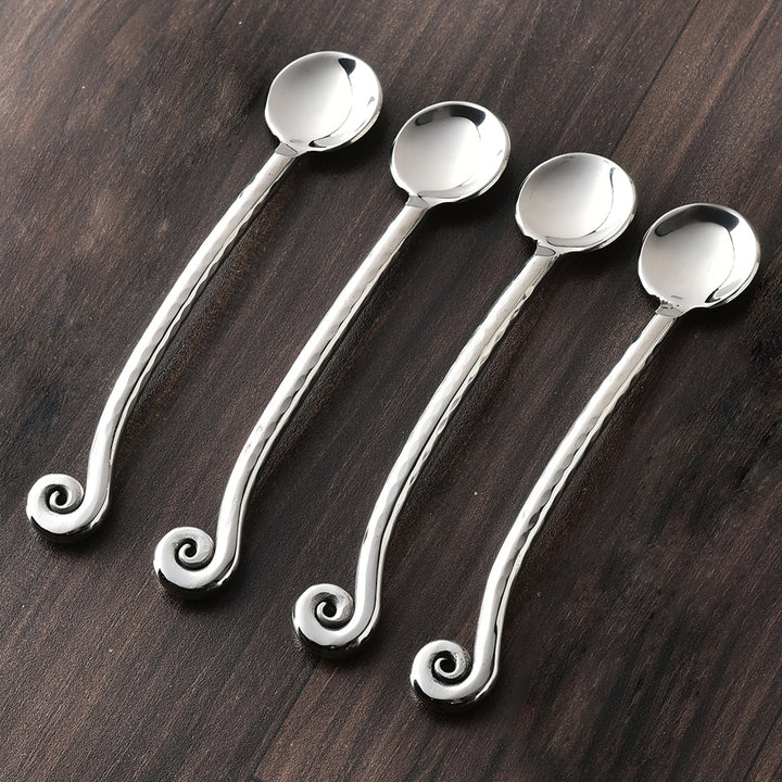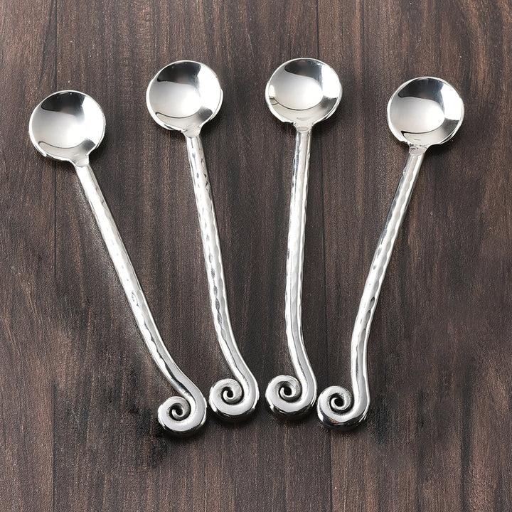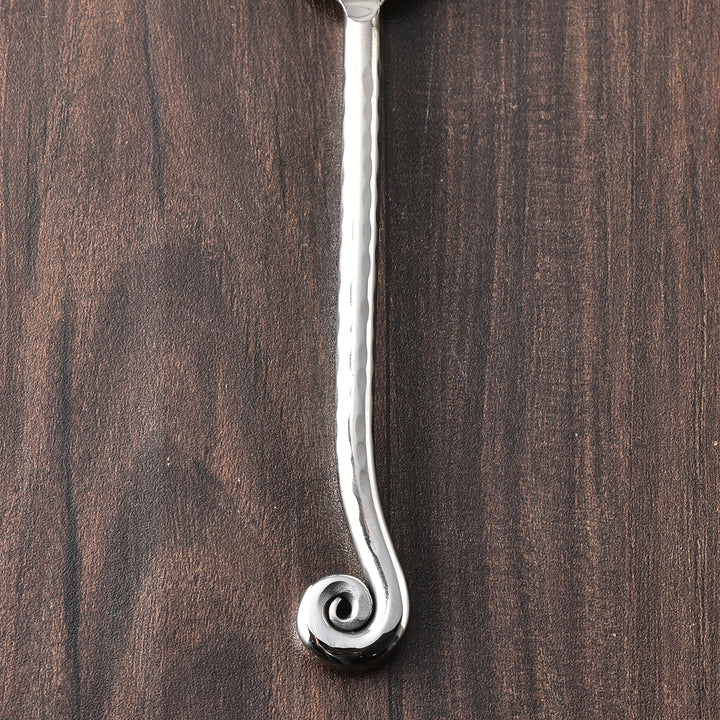 Whorl Hammered Salt Spoon 4 Pcs. Set pairs minimalist grace with tactile artistry. Each slender, mirror-finished handle is hand-hammered to catch the light, offering a poised, confident grip for a precise pinch of seasoning. The signature coiled whorl adds balance and a sculptural flourish—an elegant cue to fine craftsmanship at the table. Perfectly scaled for salts and herbs, these spoons turn everyday seasoning into a quiet ritual of refinement.
