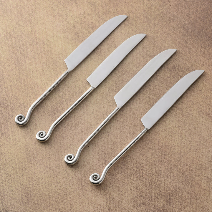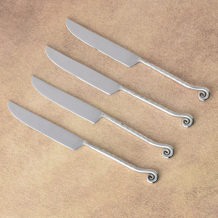 Forged for performance and poise, the Whorl Hammered Steak Knife Set pairs a razor-sharp edge with artisanal texture for confident, effortless cuts. Slender, mirror-sheened handles are meticulously hammered to catch the light and enhance grip, culminating in a signature coiled whorl—a balanced, sculptural flourish that feels intentional in the hand. Crafted in durable stainless steel, these knives marry timeless form with everyday resilience, elevating every steak to a moment of refinement at the table.