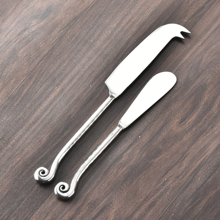 Elevating every spread, the Whorl Hammered Traditional Cheese Knife and Butter Spreader Set pairs minimalist poise with artisan tactility. Mirror-polished blades glide cleanly, while elongated, hand-hammered handles catch the light and secure a confident, balanced grip. Each silhouette resolves in a coiled whorl—a quiet flourish that anchors movement and adds sculptural grace to board and table alike. Designed for timeless service and effortless ceremony, it turns simple servings into moments of considered refinement.