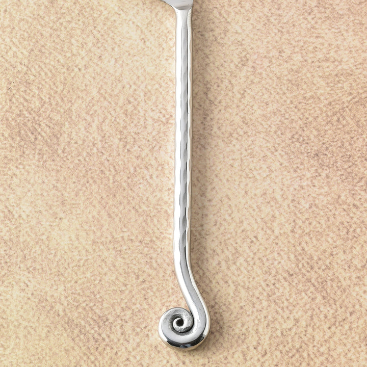 Elevate the cheese course with the Whorl Hammered Traditional & Soft Cheese Knife Set—where artisanal poise meets purposeful design. The traditional blade slices cleanly and serves with twin prongs, while the perforated soft-cheese blade glides through Brie and Camembert without sticking for crisp, elegant cuts. Mirror-smooth, hand-hammered handles catch the light and offer a confident, tactile grip, culminating in the signature coiled whorl—a balanced, sculptural flourish of refinement.
