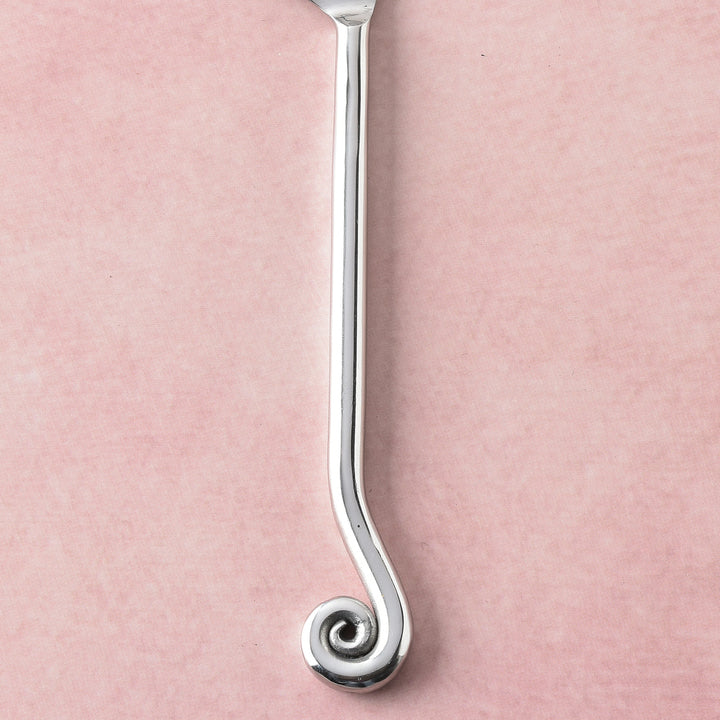 The Whorl Polished trio elevates the cheese course to ceremony: a Traditional Cheese Knife with mirror-bright poise for decisive, dignified cuts; a Soft Cheese Knife that slips through bloom and cream with non-stick grace; and a Stilton Scoop that lifts crumbles with sculptural precision. Each slender handle concludes in the signature coiled whorl—a balanced, calligraphic flourish that feels intentionally weighted in hand and exquisitely polished to behold.