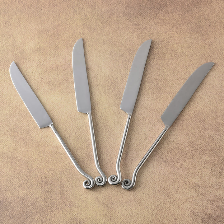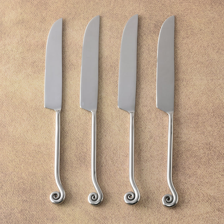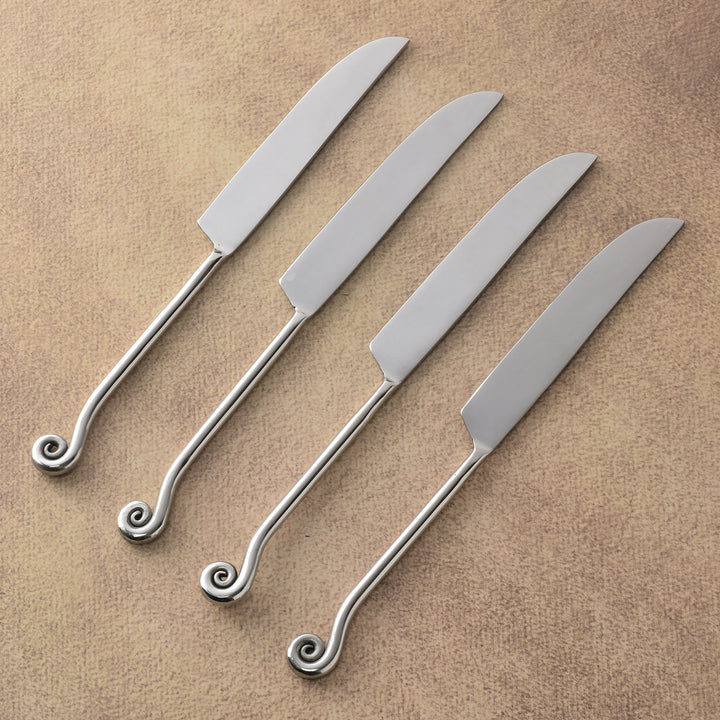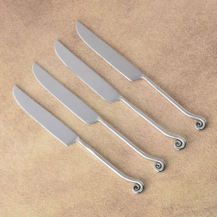 The Whorl Polished Steak Knife Set pairs mirror-finished blades with a slender, sculpted handle that settles into the palm like a whispered vow. A signature coiled whorl completes the silhouette—an elegant counterweight that steadies every decisive cut and lingers as a discreet emblem of taste. Exquisitely balanced and deliberately luminous, this set transforms carving into ceremony, bringing poised performance and reflective beauty to the most refined tables.